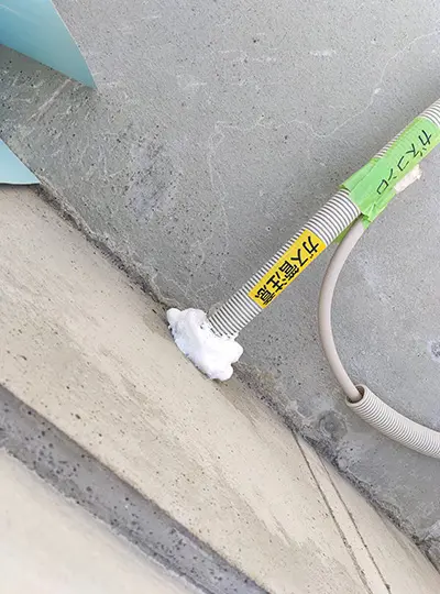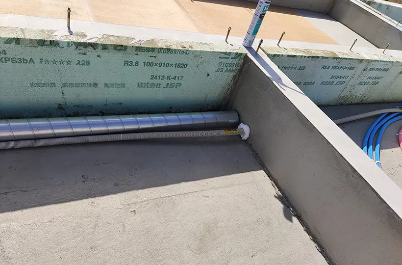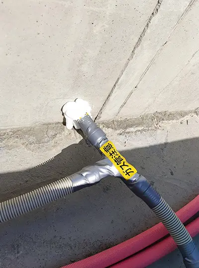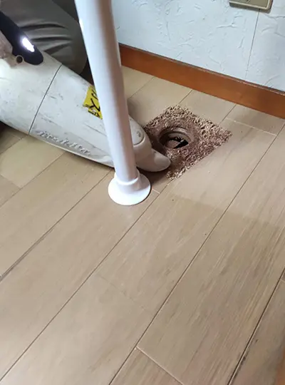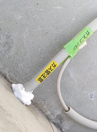 穴に通す際、防食テープを巻いてウレタンで隙間をふさぎます。見えない 床下の配管工事だからこそ手を抜きません。