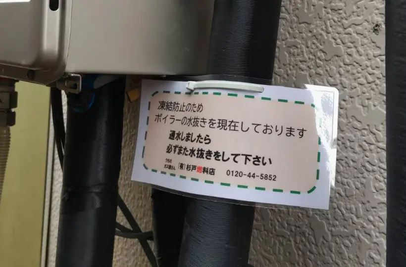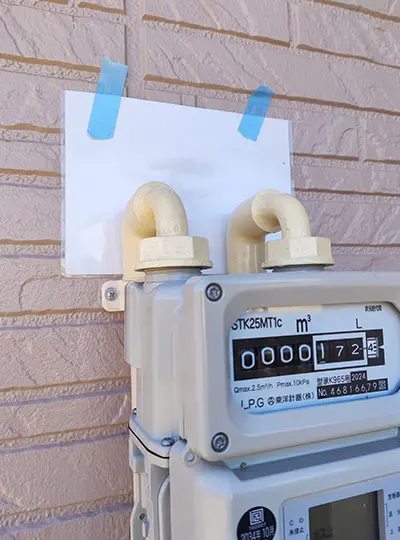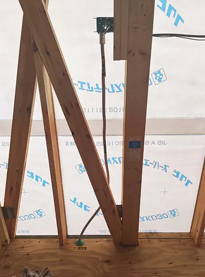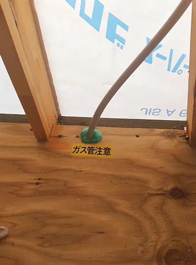 新築現場では『ガス管注意』等の表示シールをつけて大工さんにもわかりやすくしています。