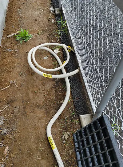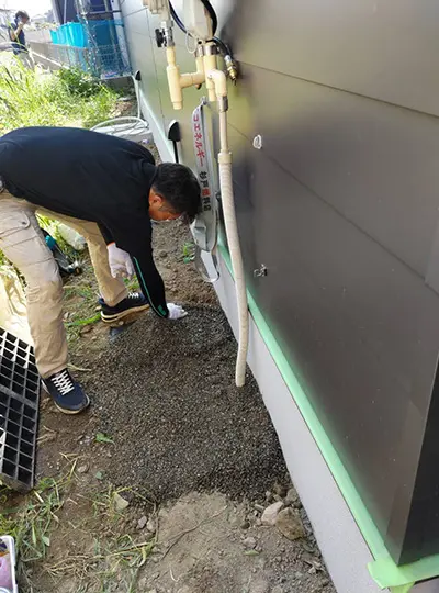 防草シート、砂利でしっかり固めて、ボンベマットを置き土台を丁寧に作ります。もちろん、気密検査もいたします。