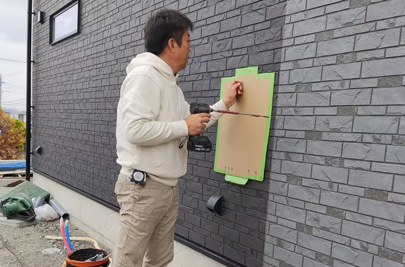 給湯器取り付け位置を型紙を使って丁寧に決めていきます。